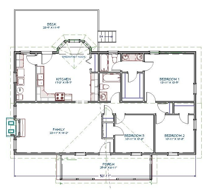 The Jefferson is another of the starter homes in this series that provide all the necessities for a growing family. The bow window in the kitchen is perfect as a breakfast nook. The front covered porch and large rear deck allows for the entertainment to flow outside. Keep in mind that this plan can be bought as is or used as a starting point for the design of your dream home.