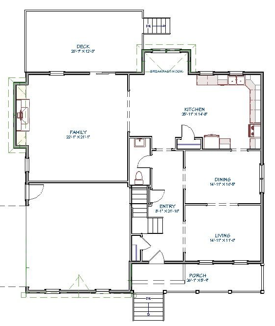 The Rose Wood is a great house that offers a similar floor plan as the Hermitage with a few modifications. One of the biggest changes is the second story balcony that changes the overall appearance of the house and makes for a relaxing space to have a cup of coffee in the mornings. This a large house coming in over 3,300 feet but has a comfortable feel to it. But with that size comes larger rooms and a terrific open first floor plan. A separate Living Room from the Family Room is on the first floor, but if it is not needed it could easily be re-purposed as an office of child’s play room. The laundry room is on the second floor where most of the laundry is generated. Keep in mind that this plan can be bought as is or used as a starting point for the design of your dream home.